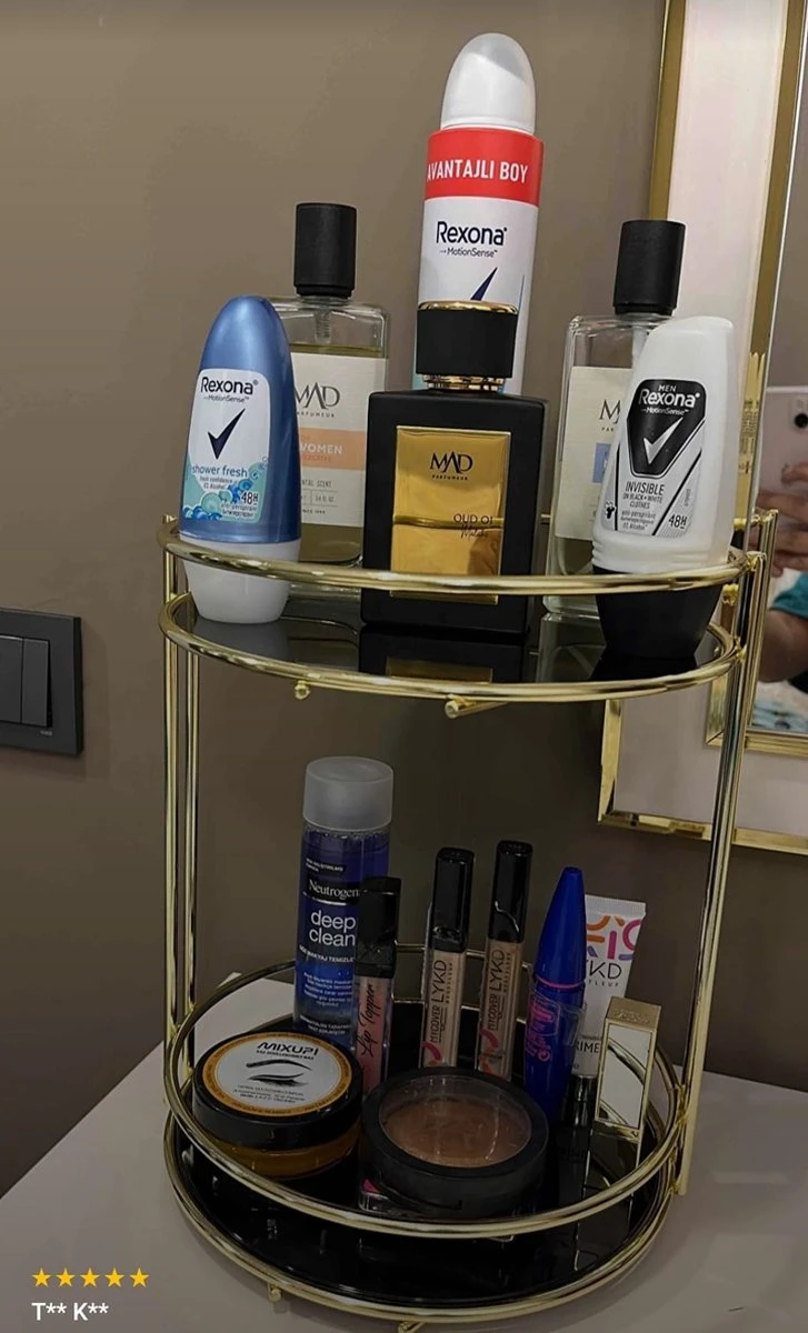 badkamer cosmetische sieraden organizer multifunctionele organizer 2-laags dienblad traktaties -hoge glans -roestvrij goud verchroomd -volledig roestvrij dik staal -laag bases zijn gemaakt van glanzend zwart acryl materiaal. -De vloermatten zijn wasbaar, verwijderbaar en breukvast. -De plaatmaat is 23 cm en biedt een breed presentatieoppervlak van 2 verdiepingen. -Er zijn antislip- en antikrasvoetjes op de basis die voorkomen dat de vloer bekrast raakt. – totale hoogte: 27 cm – hoogte tussen planken: 22 cm – breedte 23 cm