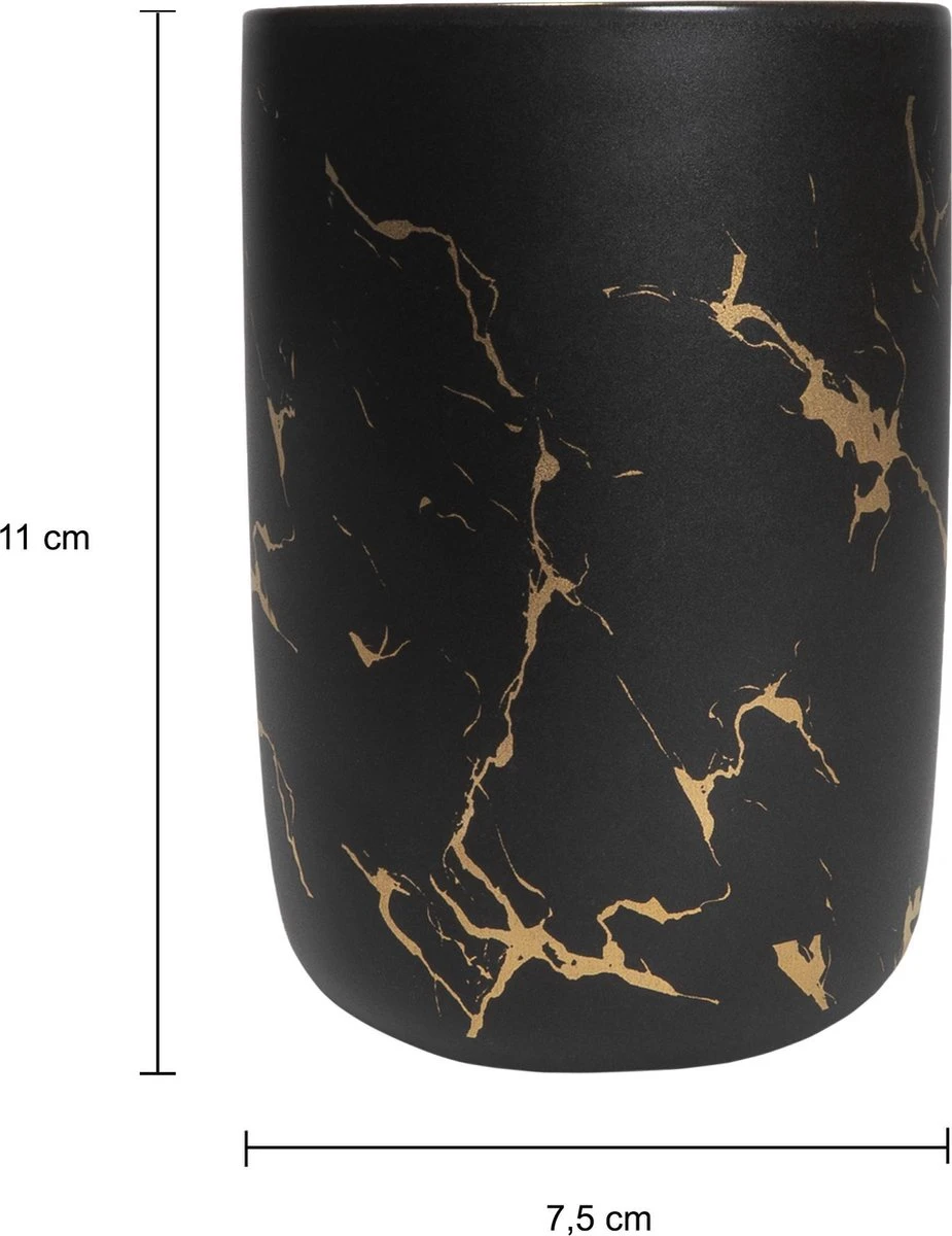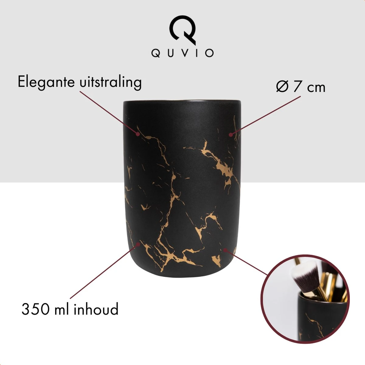 De QUVIO Make-up kwastenhouder en tandenborstelhouder is een beker die zoals gezegd bedoeld is om diverse producten netjes en georganiseerd in te plaatsen. De beker heeft een optimale grootte voor bijvoorbeeld het plaatsen van meerdere kwastjes of meerdere tandenborstels erin. De diameter van het product is in totaal 7 centimeter. Daarnaast heeft het artikel een hoogte van 11 centimeter, wat ook ideaal is voor kwasten en tandenborstels. De houder zorgt dat alles er netjes in blijft zitten en ook erg netjes oogt. Overigens geeft de houder een erg elegante uitstraling met de zwarte en gouden kleuren die het bevat.