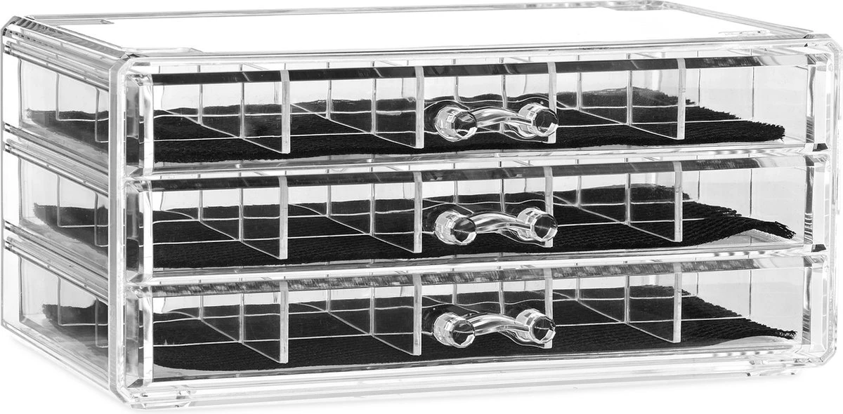 Deze veelzijdige te gebruiken acrylbox helpt om weer orde te krijgen in de make-up chaos. Met de 3 lades biedt de make-up organizer genoeg ruimte voor nagellak, lippenstift, crèmes en poedertjes. Ook als sieradendoos voor ringen en armbanden is het ladekastje ideaal. Beslis zelf, of je de lade als groot vak of met 15 kleine vakjes wilt gebruiken. De inzet kan er eenvoudig uitgehaald worden, zodat je de opbergbox aan je wensen kunt aanpassen. De losse bekleding beschermd de organizer tegen krassen en zorgt er op hetzelfde moment voor, dat accessoires niet glijden.